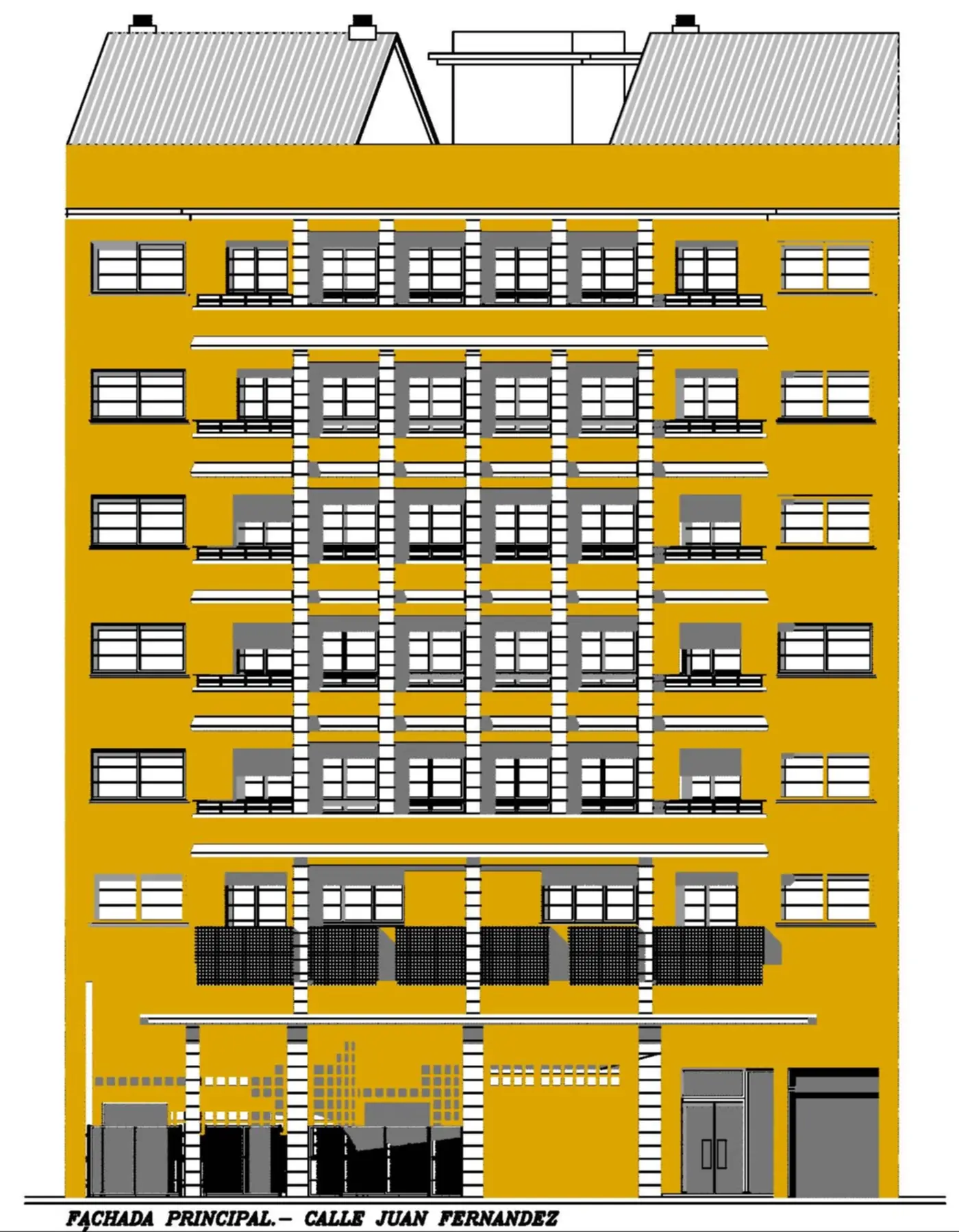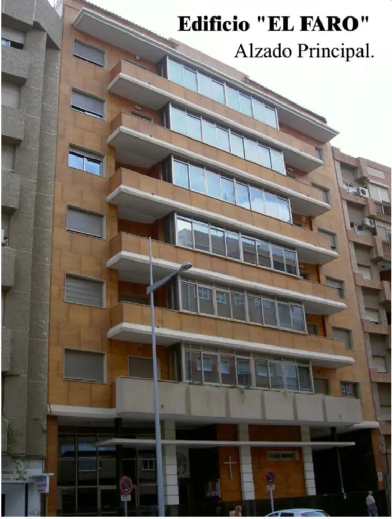 En plena calle Juan Fernández, entre medianeras y con una fachada alineada al vial sin retranqueos, se alza el Edificio El Faro, una pieza urbana que combina función residencial y uso comunitario en un entorno consolidado del centro de Cartagena.