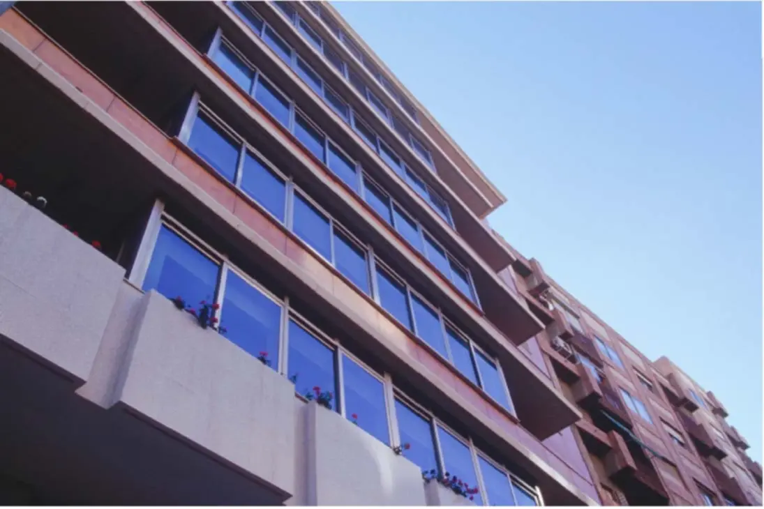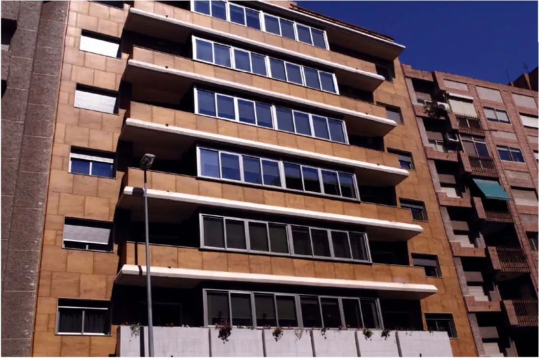 El lenguaje arquitectónico es sobrio y rotundo. La fachada, revestida en tonos cálidos, alterna paños ciegos y ventanales con cerramientos acristalados que generan ritmo y profundidad. Las terrazas voladas, horizontales y expresivas, aportan carácter y matizan la relación entre interior y exterior, protegiendo del soleamiento y abriendo las viviendas al entorno urbano.
