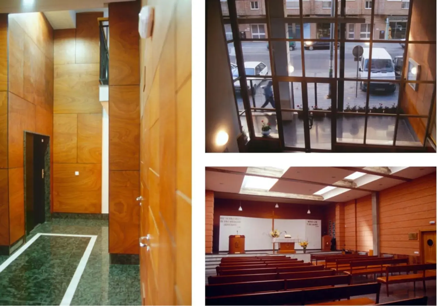 El acceso a las viviendas se realiza desde la planta baja, donde también se encuentran las zonas comunes. La planta primera alberga dos viviendas y un despacho vinculado al uso parroquial. Las nueve viviendas restantes se disponen entre las plantas superiores, permitiendo una distribución eficiente y funcional en una parcela de geometría ajustada.