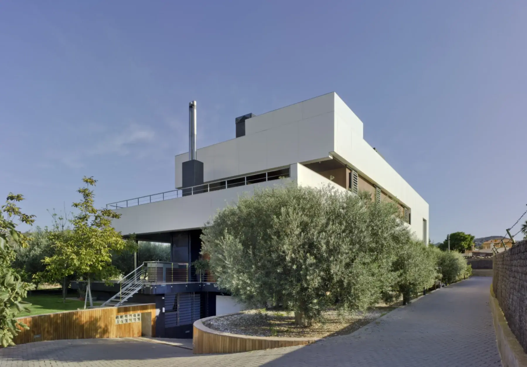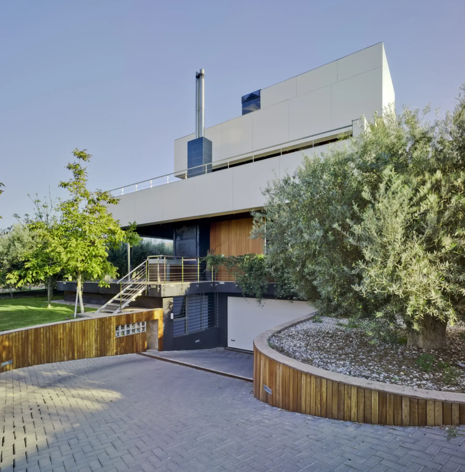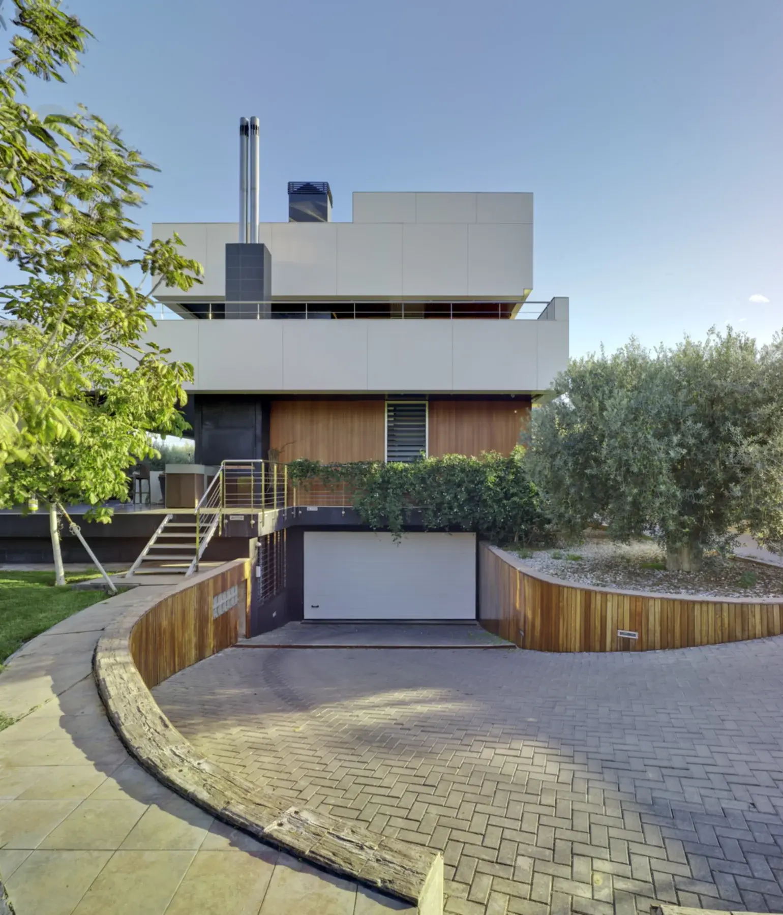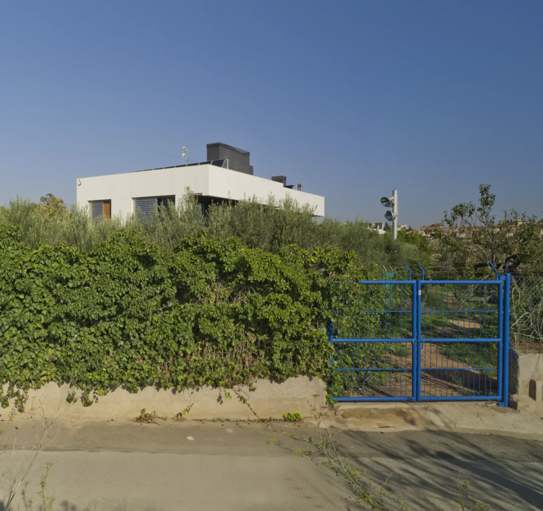 En una generosa parcela envuelta por vegetación, esta vivienda unifamiliar se despliega en tres alturas —semisótano, planta baja y planta primera— conectadas a través de una escalera interior que articula el recorrido vertical de la casa.