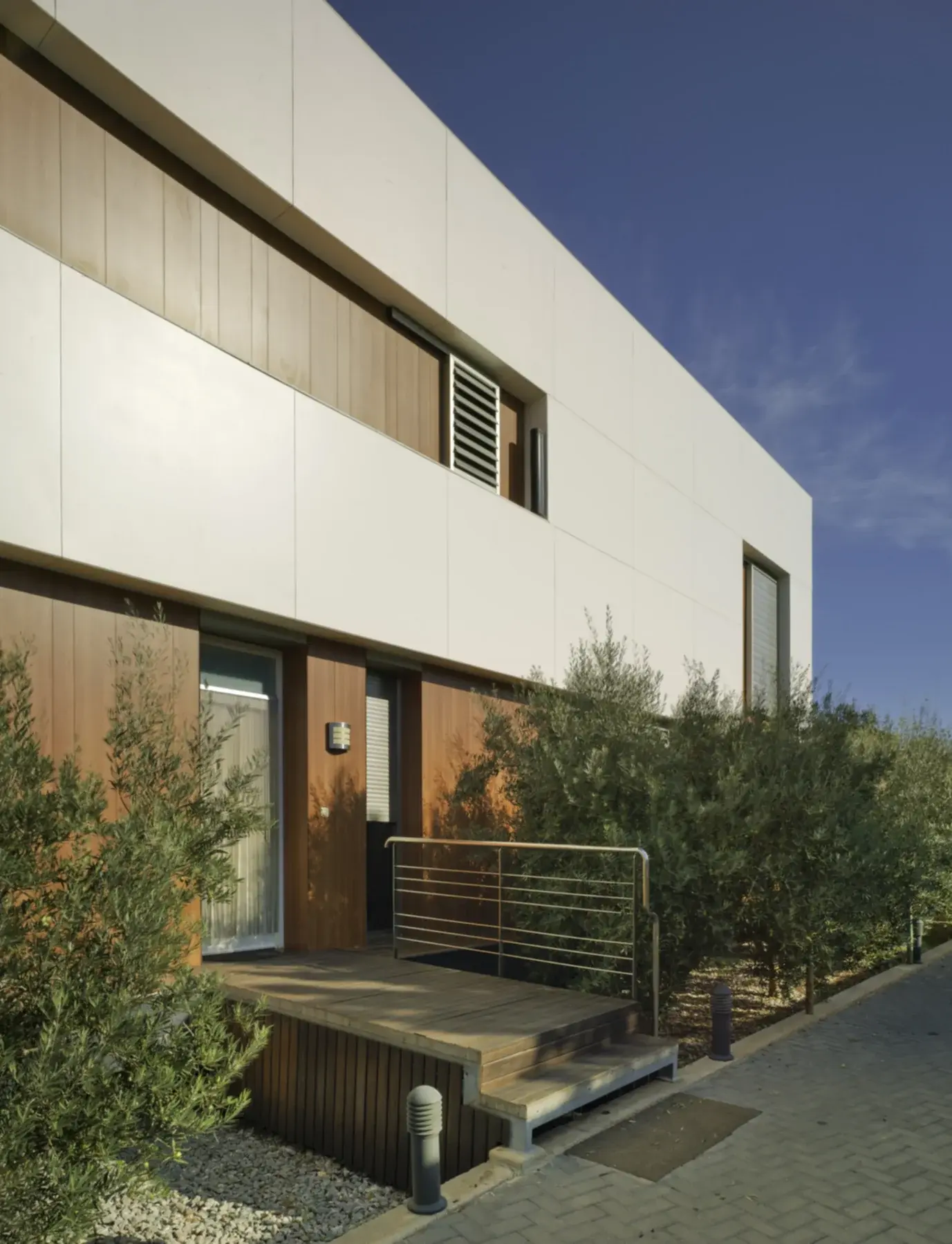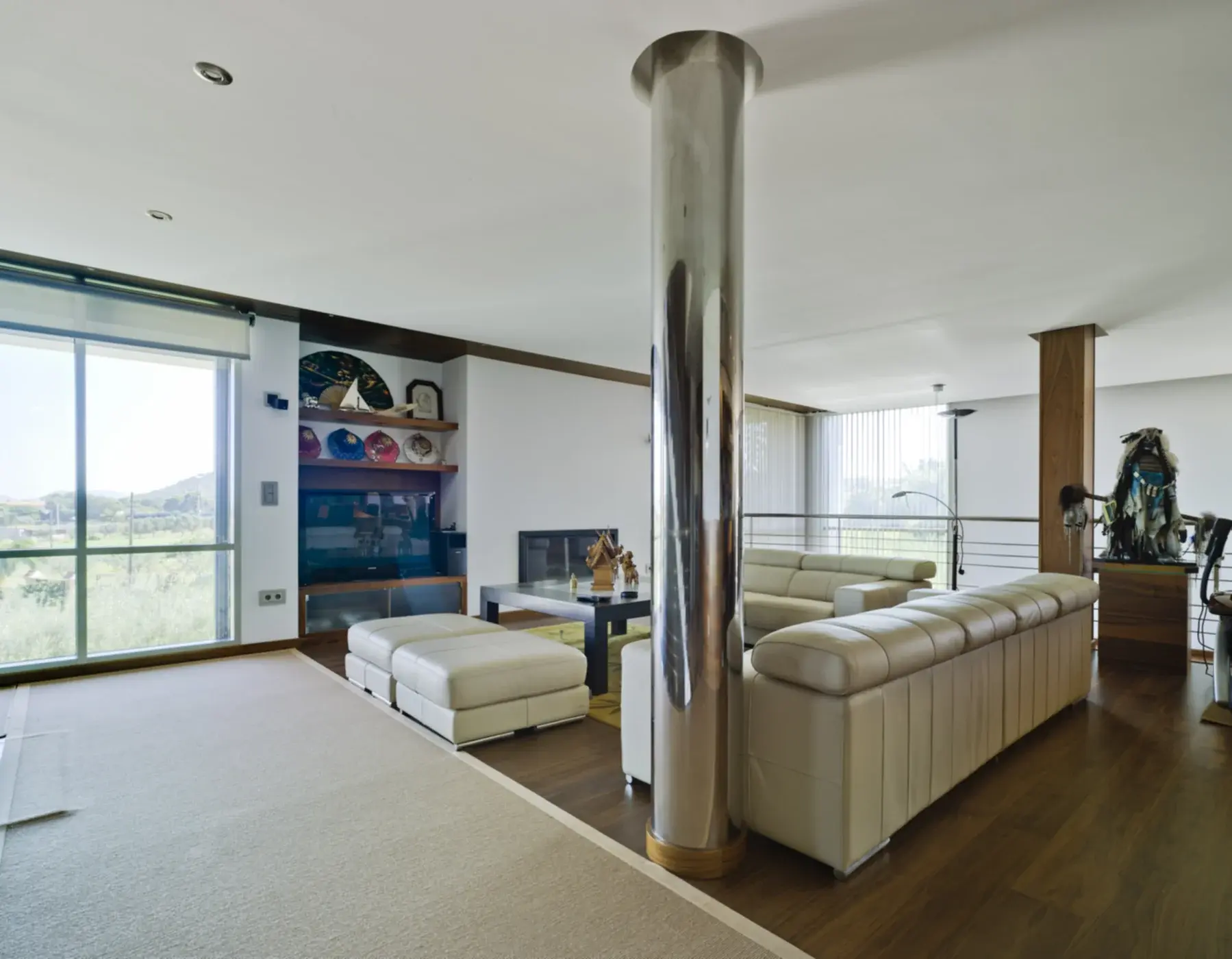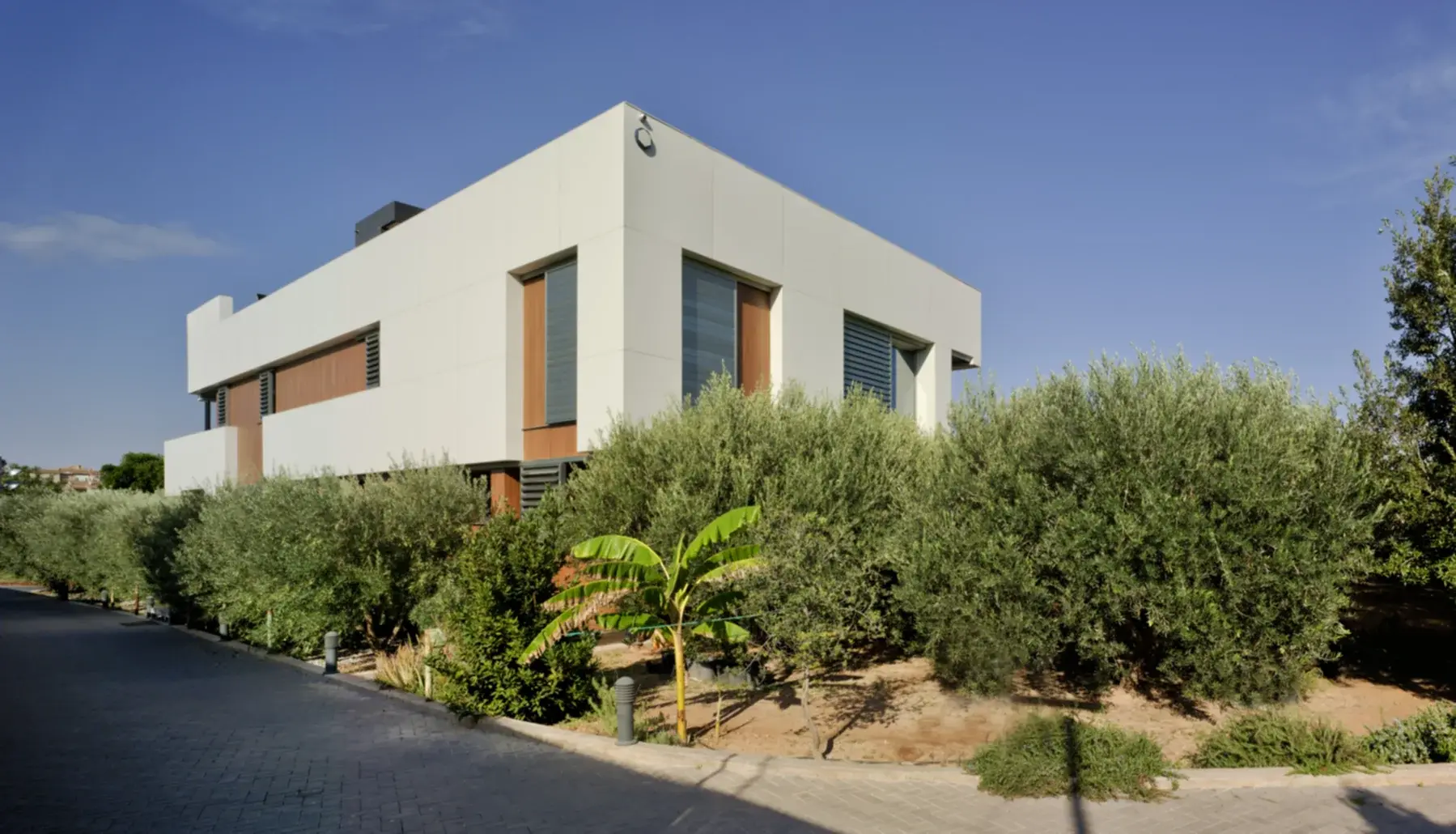 En una generosa parcela envuelta por vegetación, esta vivienda unifamiliar se despliega en tres alturas —semisótano, planta baja y planta primera— conectadas a través de una escalera interior que articula el recorrido vertical de la casa.