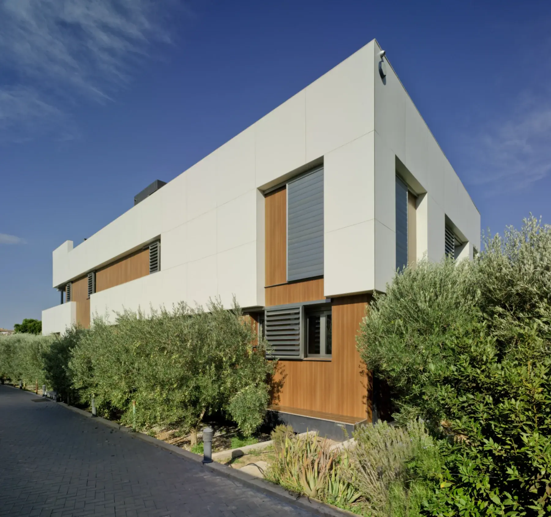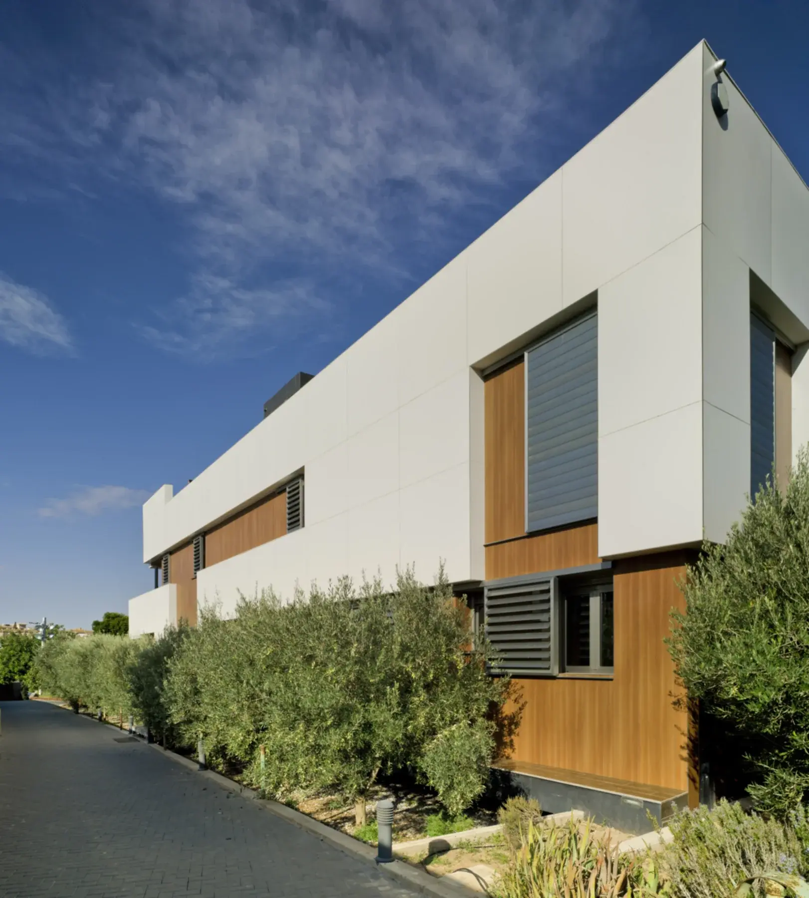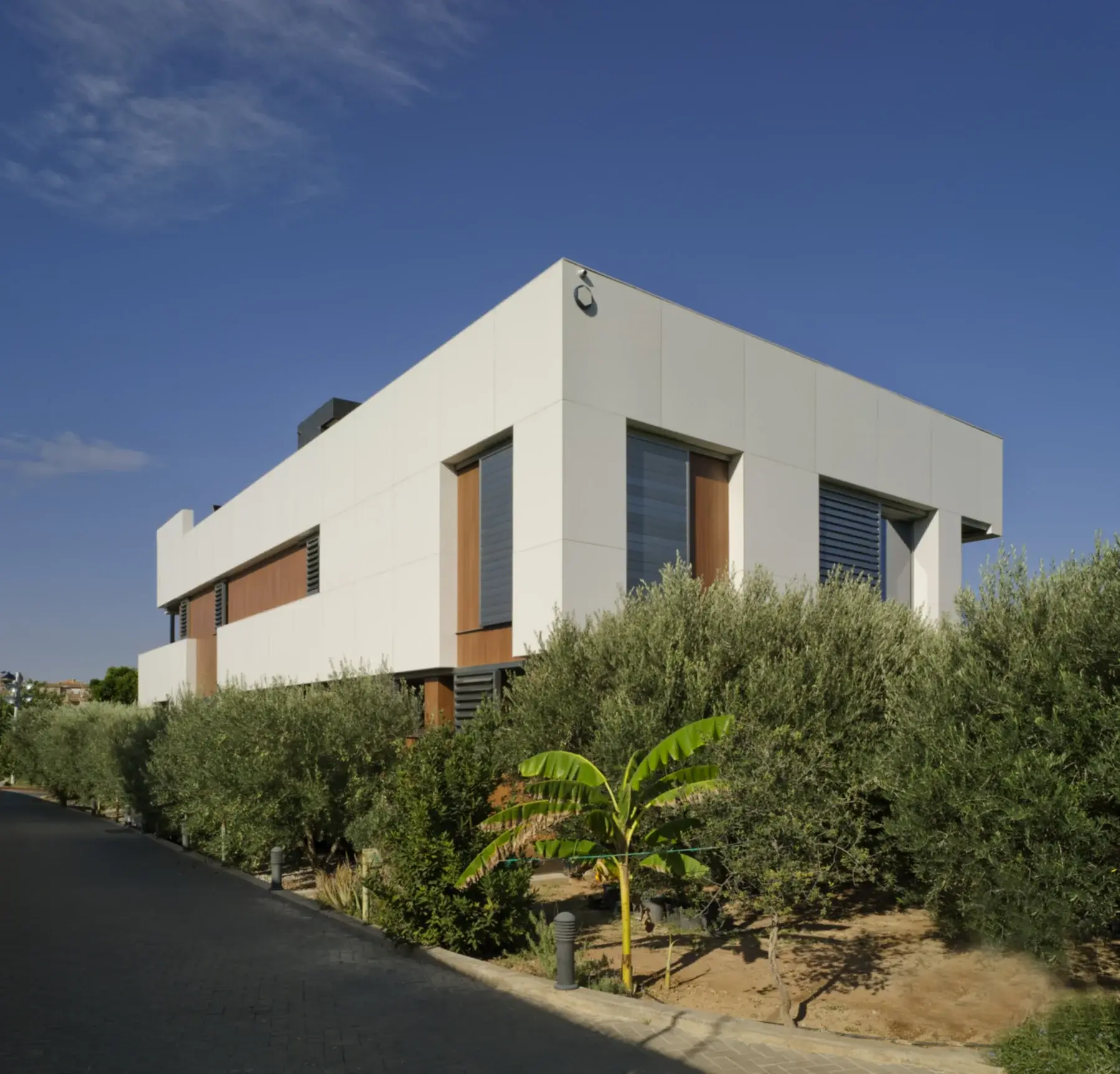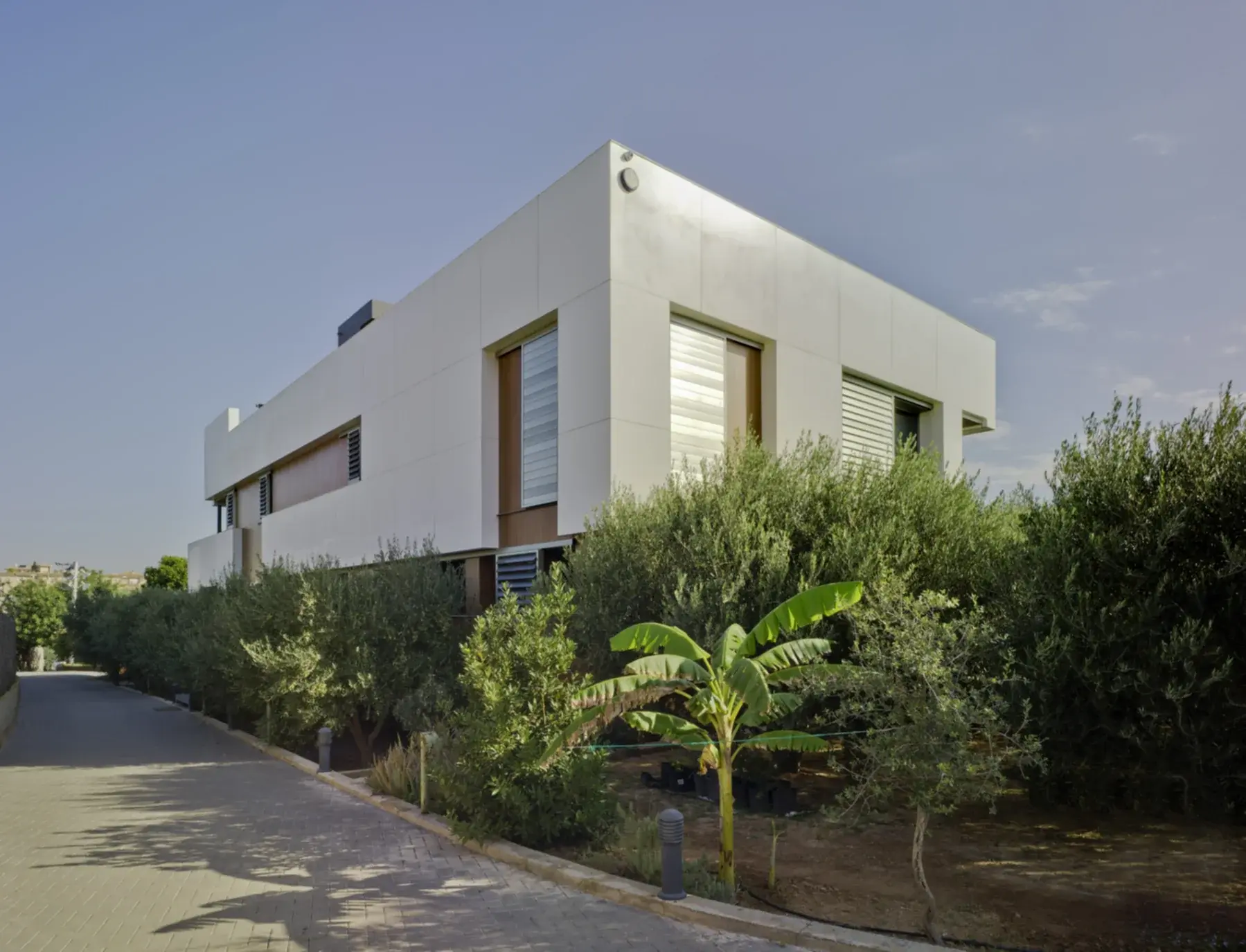 En una generosa parcela envuelta por vegetación, esta vivienda unifamiliar se despliega en tres alturas —semisótano, planta baja y planta primera— conectadas a través de una escalera interior que articula el recorrido vertical de la casa.