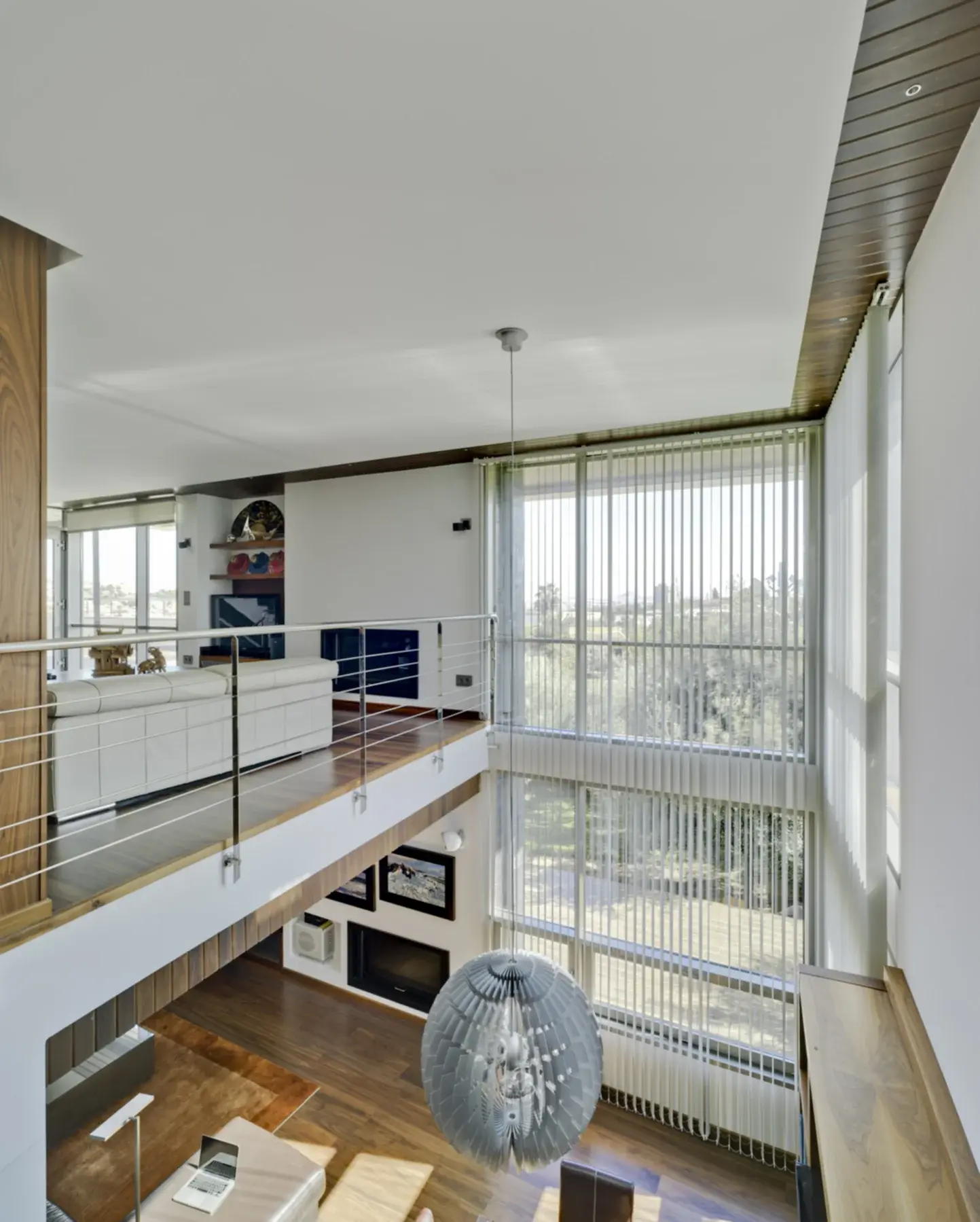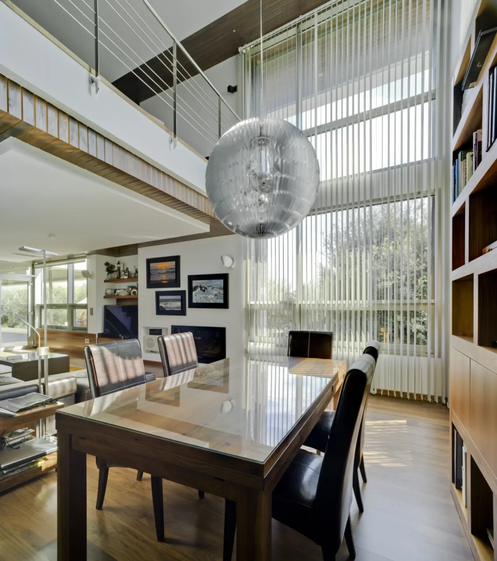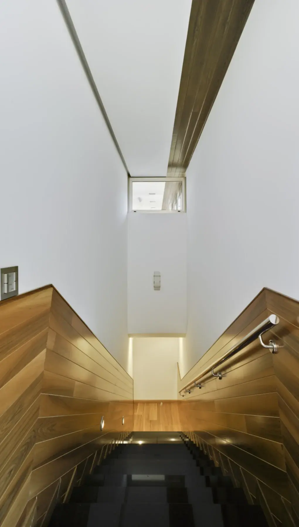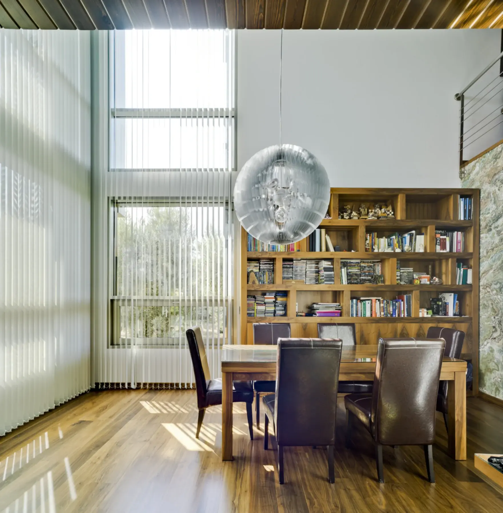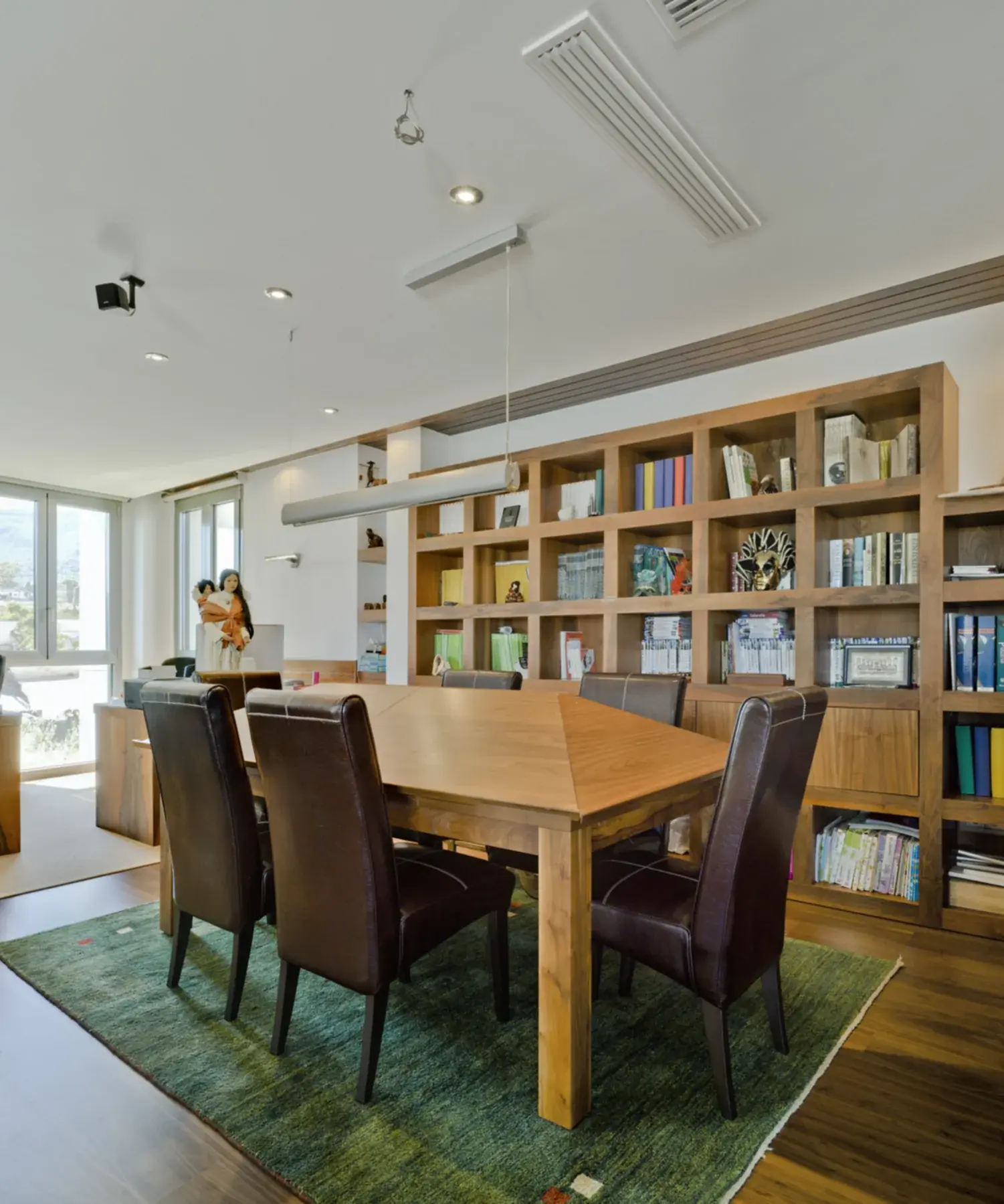 La planta baja acoge los espacios de día, abiertos al jardín mediante grandes ventanales que integran el paisaje en la vida cotidiana. En el corazón de la vivienda, una zona a doble altura llena de luz natural genera una atmósfera de amplitud y verticalidad, presidida por una gran librería que acompaña la vida cotidiana y define la verticalidad del espacio.