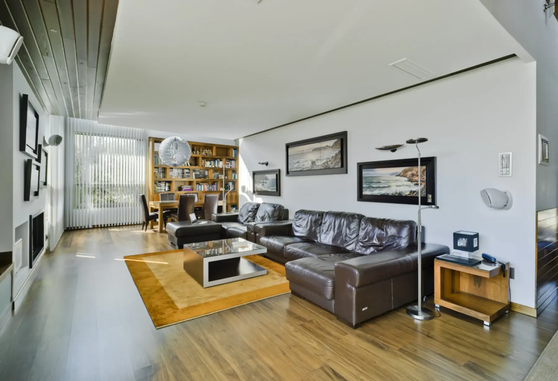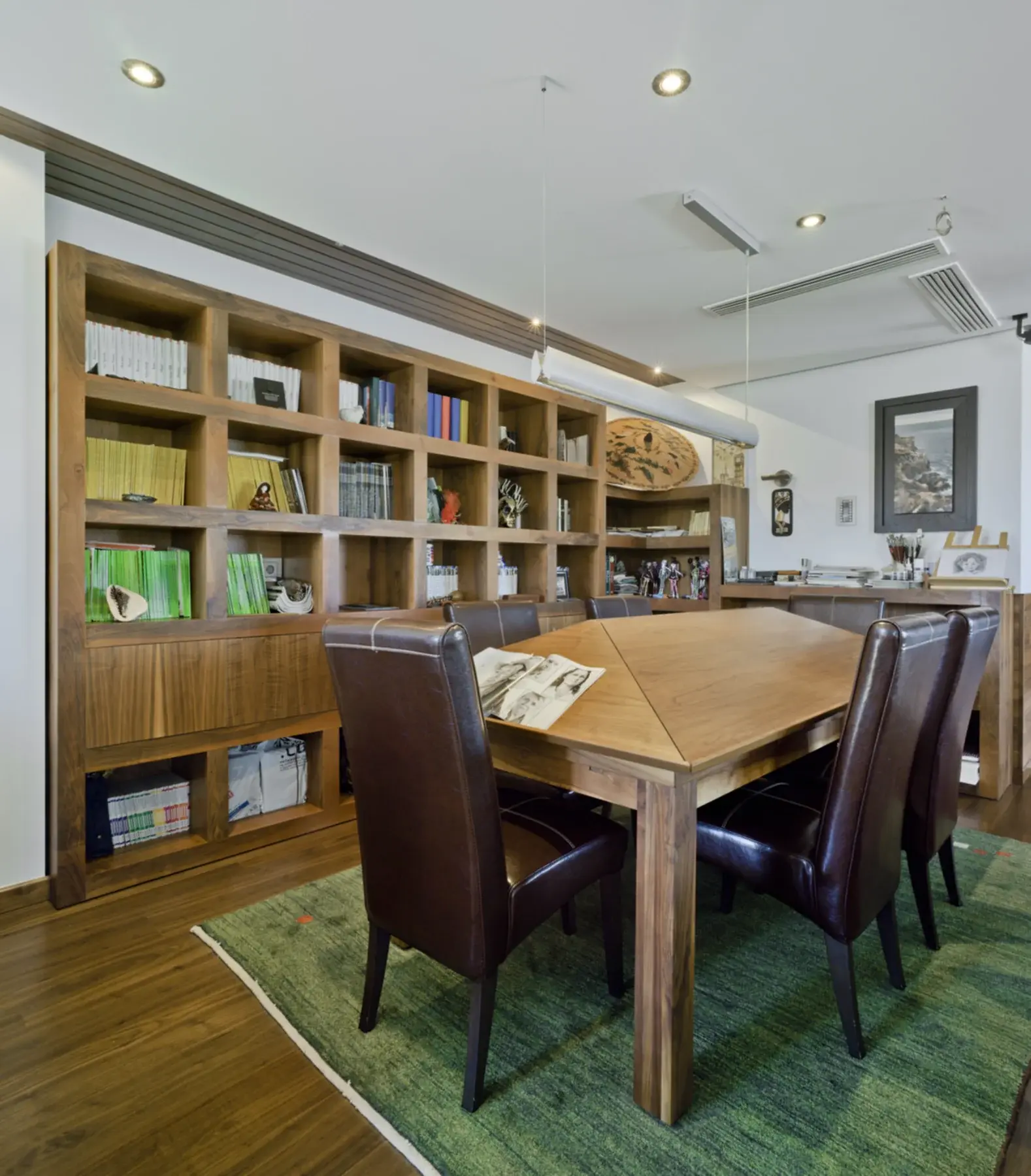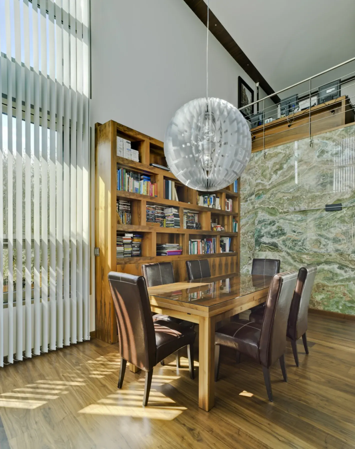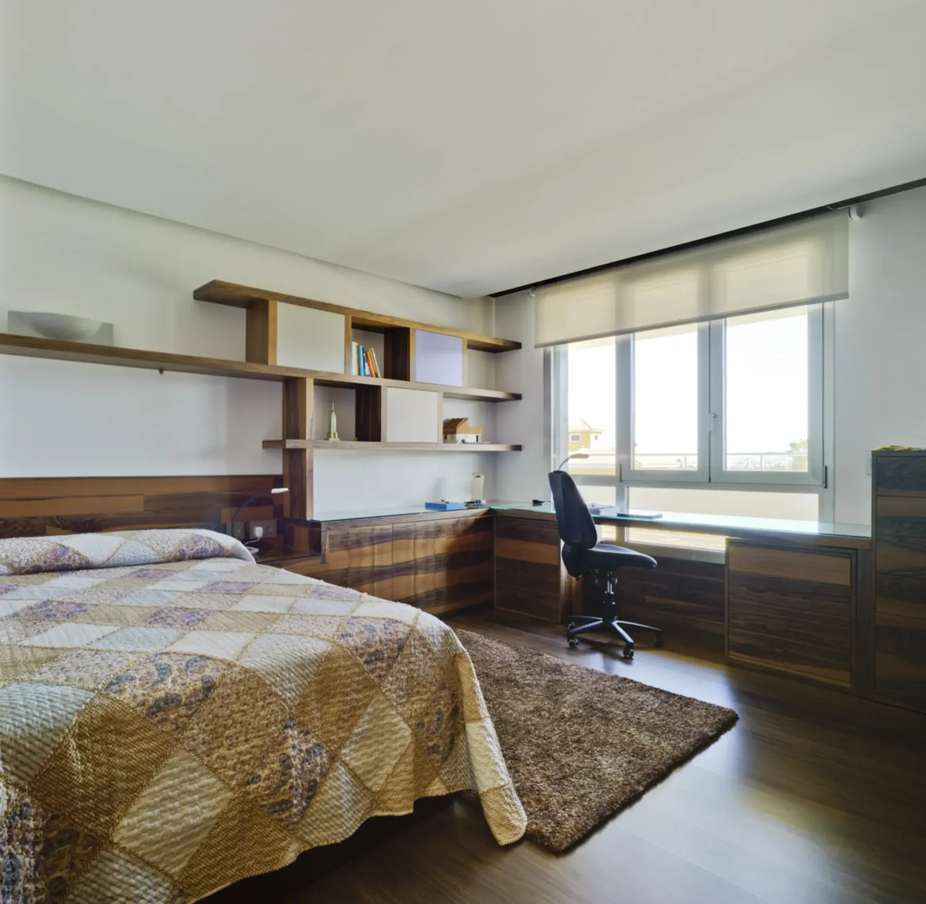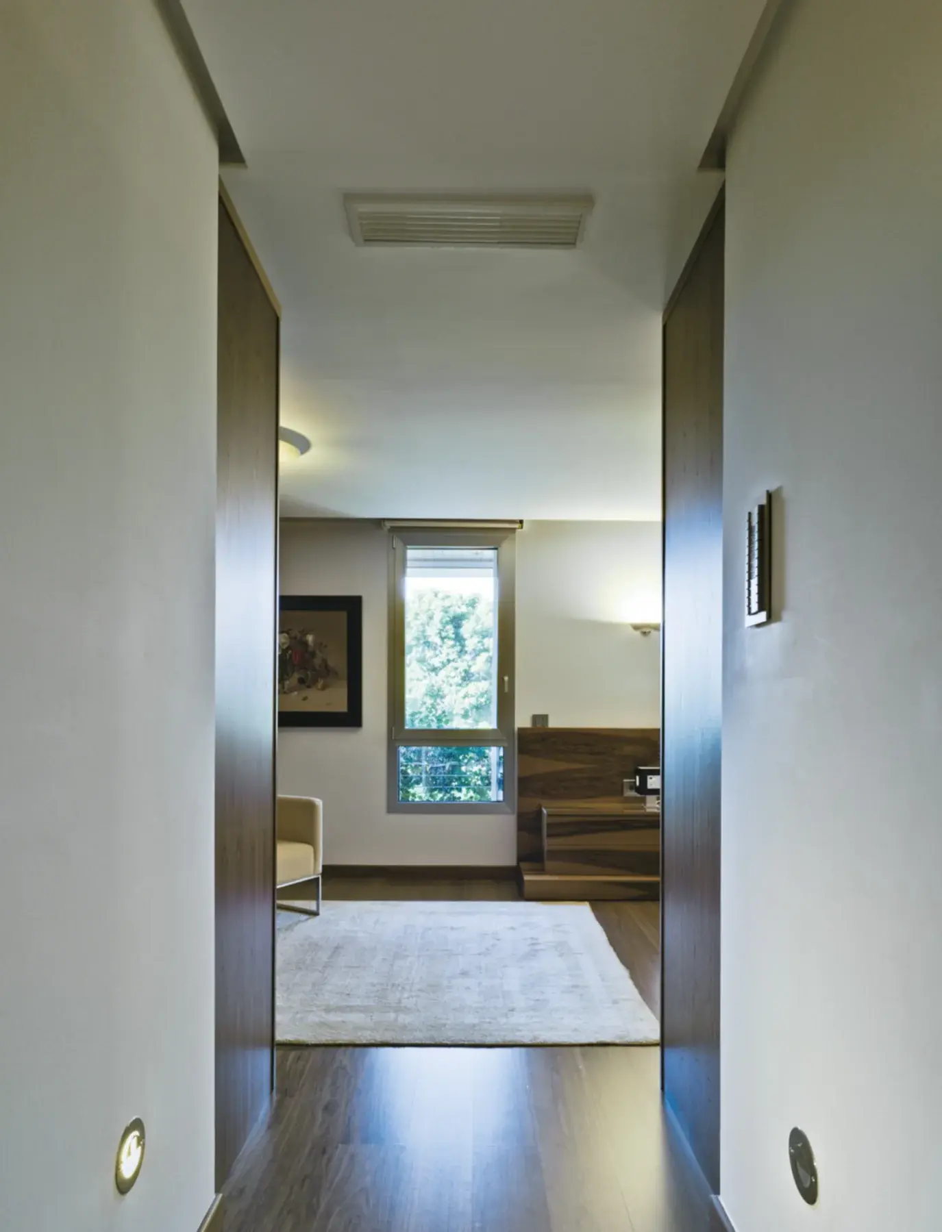La planta baja acoge los espacios de día, abiertos al jardín mediante grandes ventanales que integran el paisaje en la vida cotidiana. En el corazón de la vivienda, una zona a doble altura llena de luz natural genera una atmósfera de amplitud y verticalidad, presidida por una gran librería que acompaña la vida cotidiana y define la verticalidad del espacio.