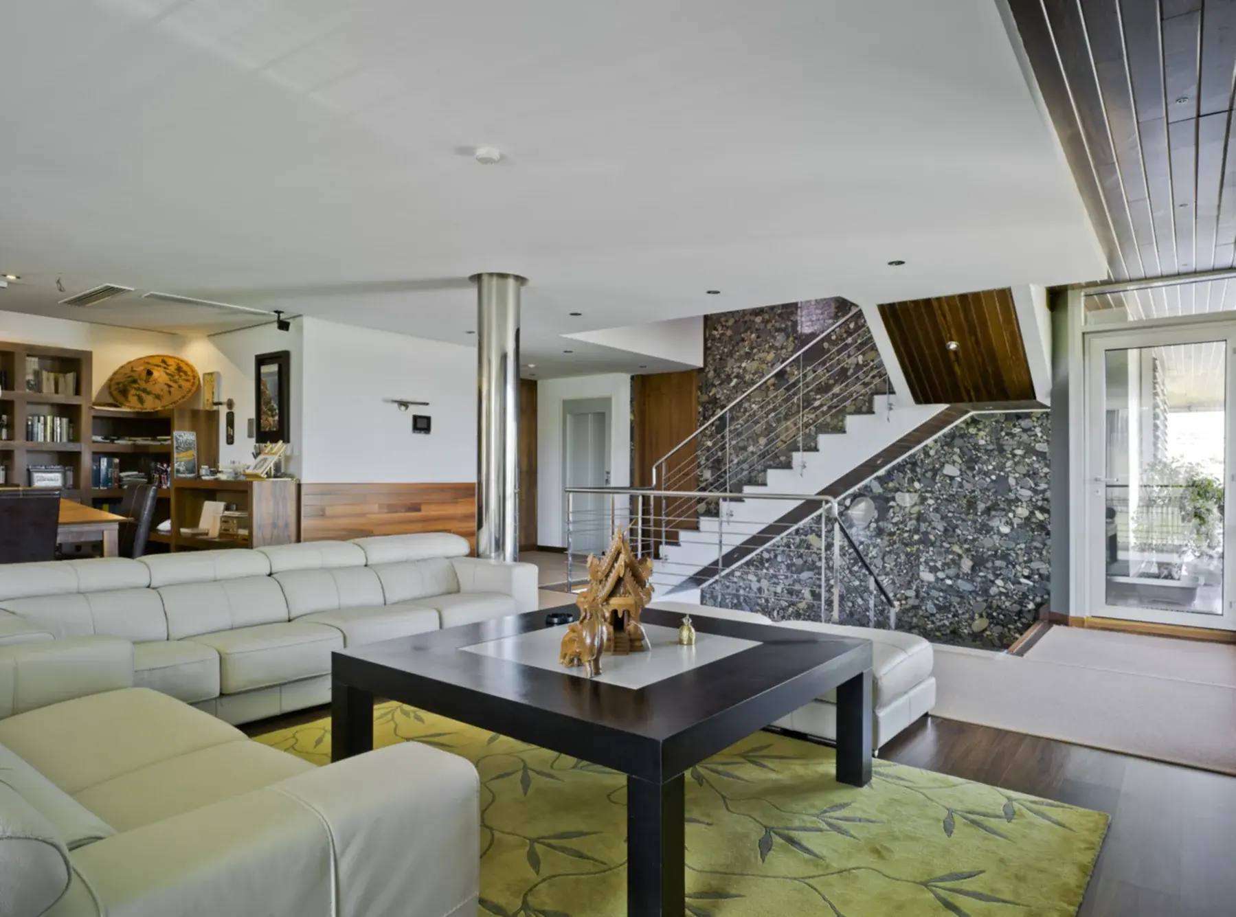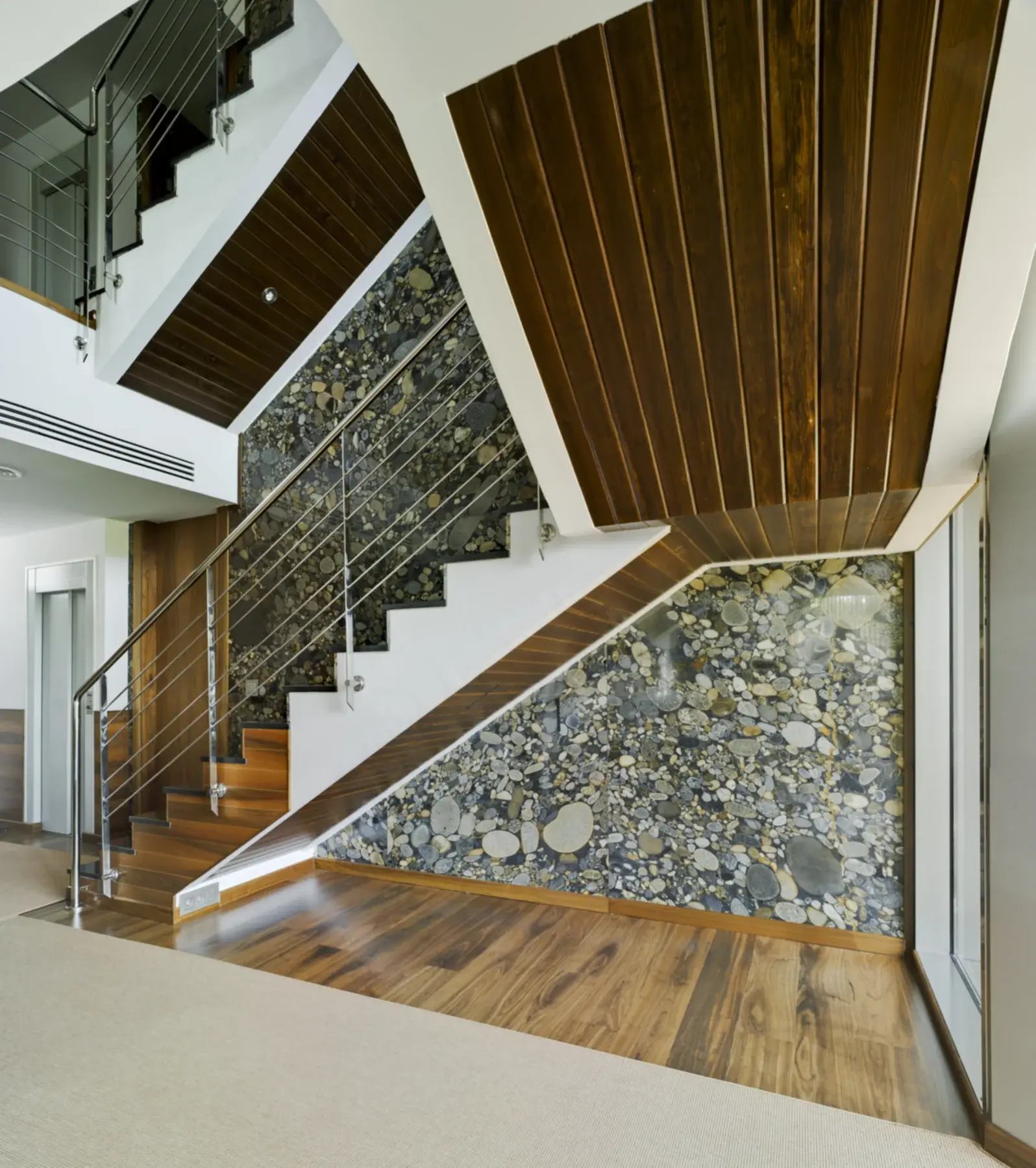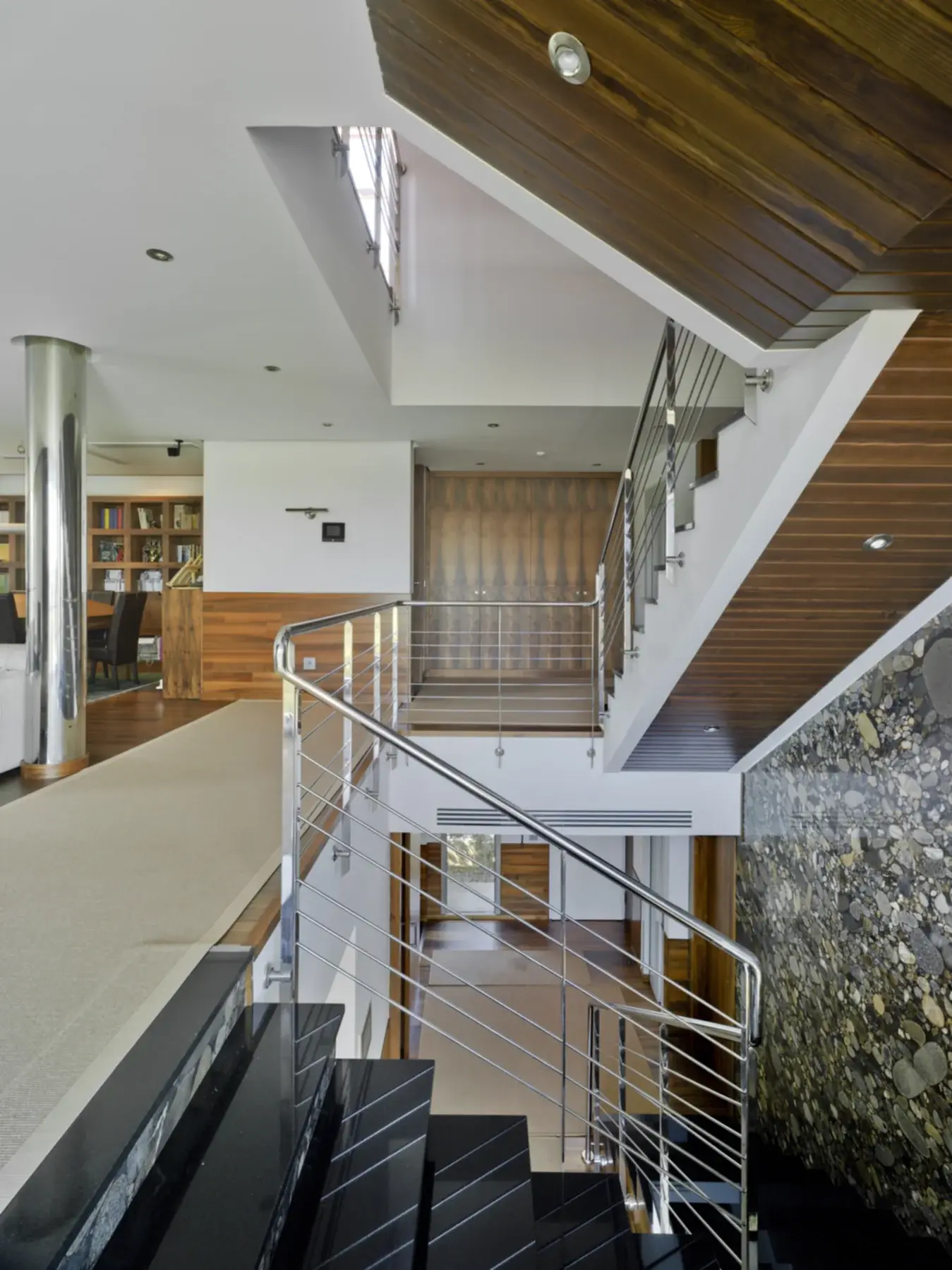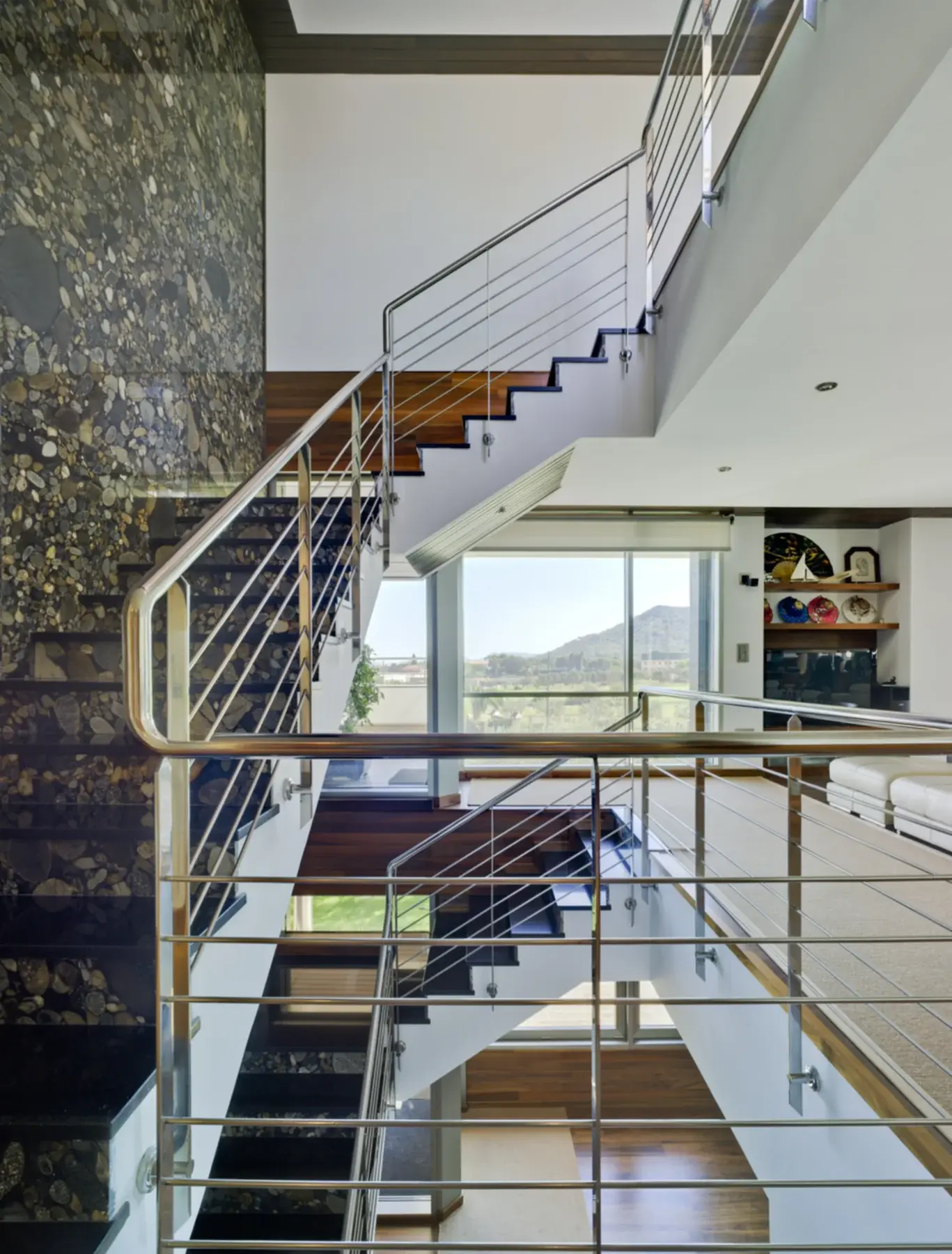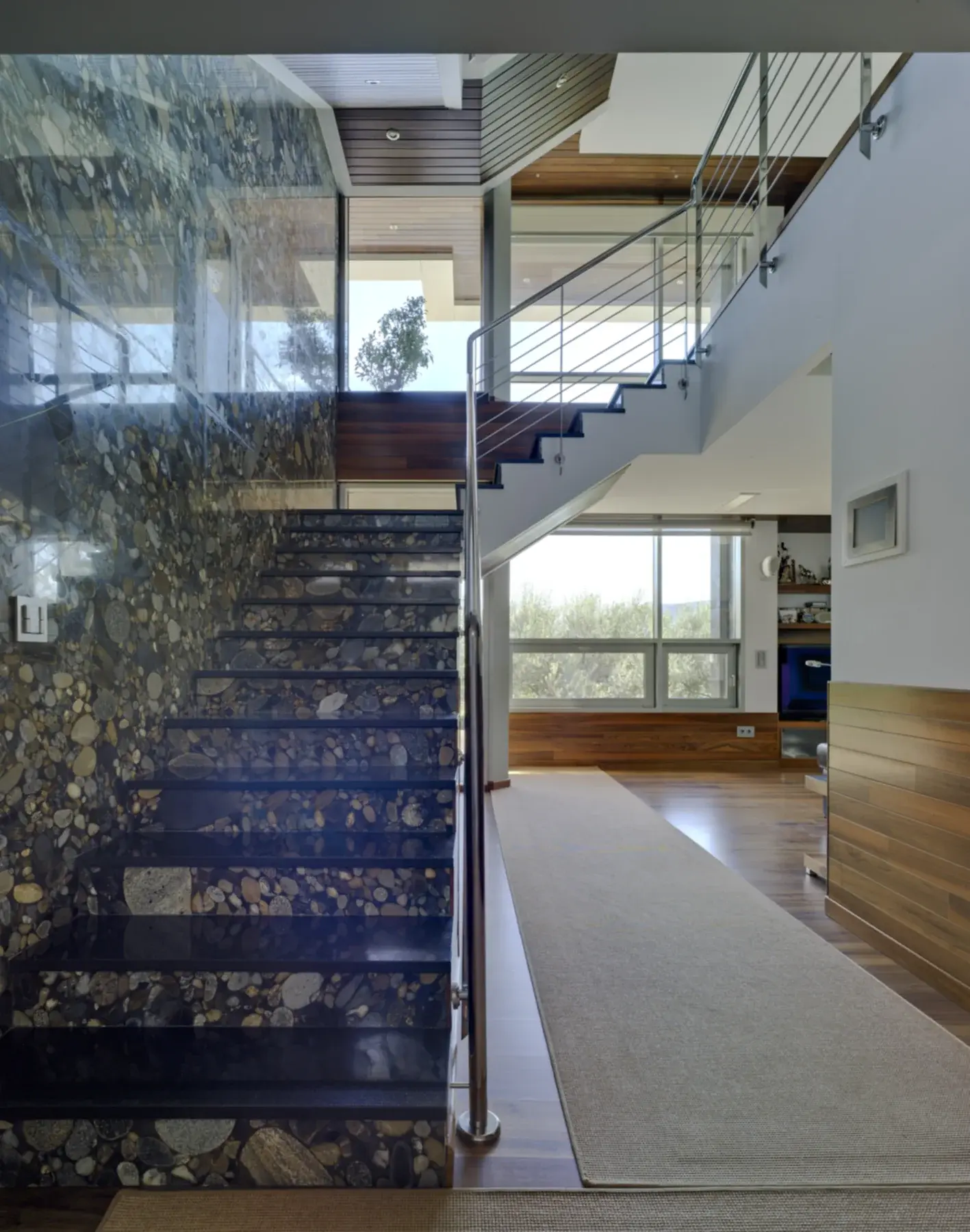 La escalera, custodiada por una pared de piedra natural, introduce una textura sobria y cálida que acompaña el ascenso a la planta superior, donde se ubican las estancias privadas, elevadas sobre el terreno para disfrutar de la luz y las vistas.