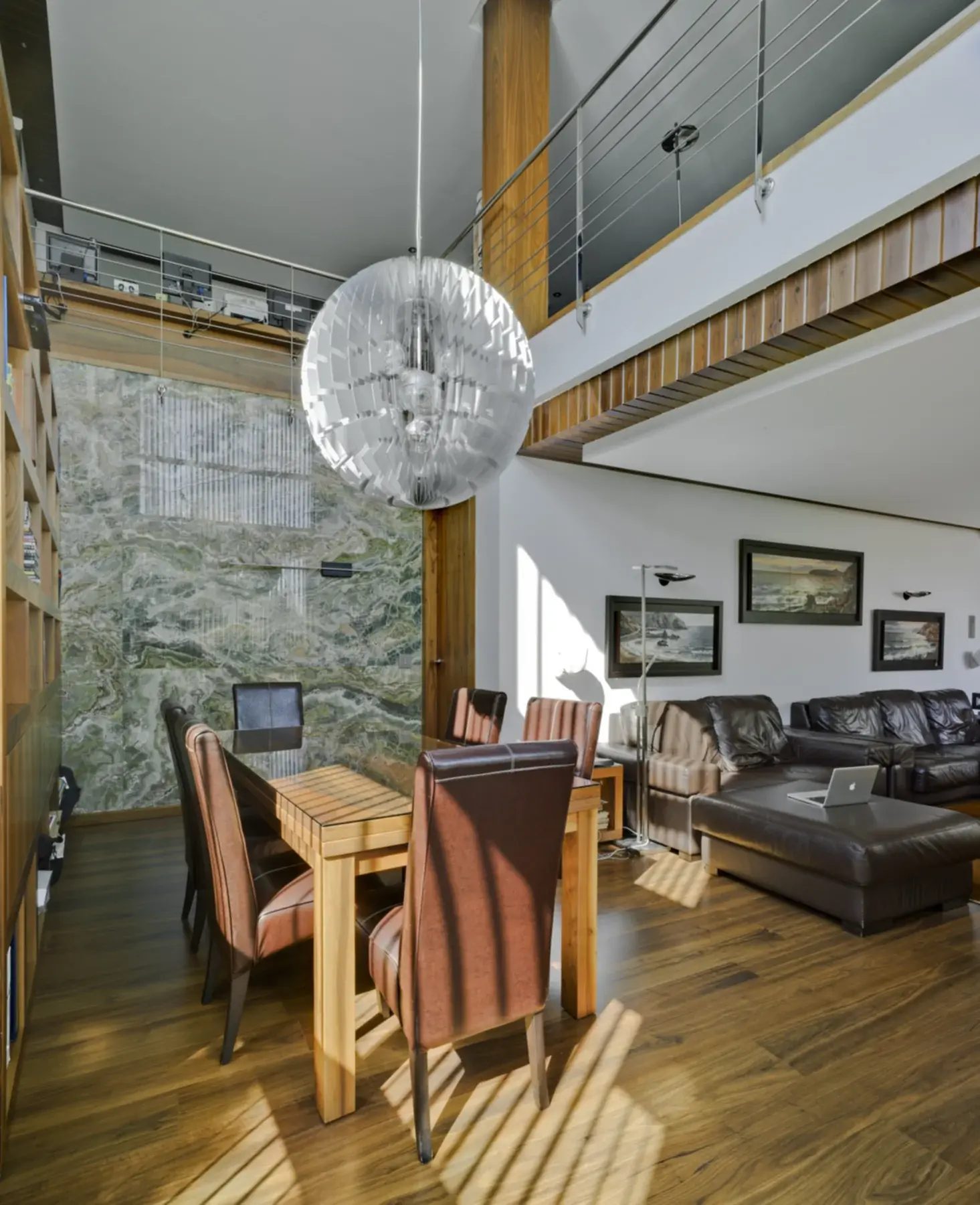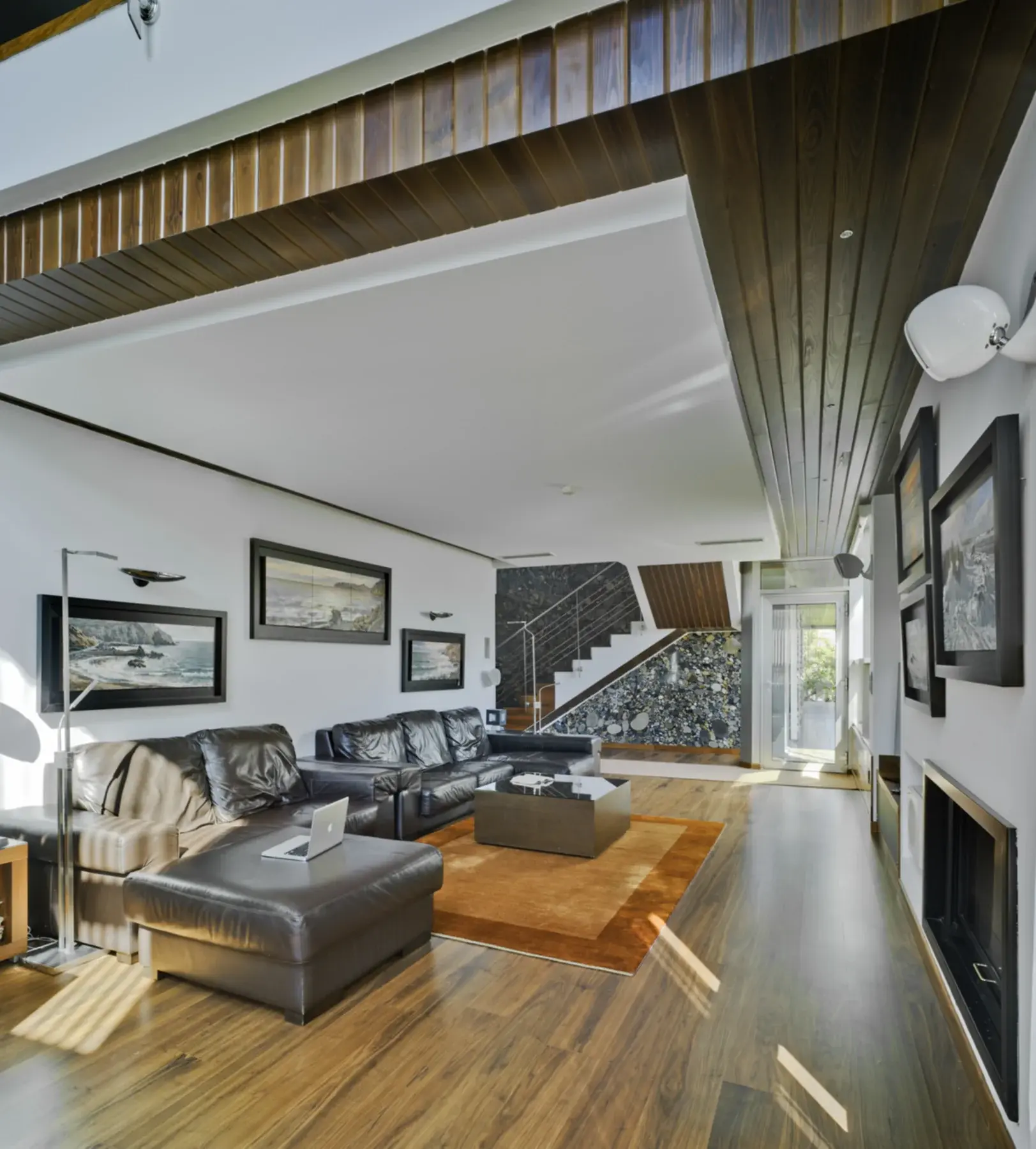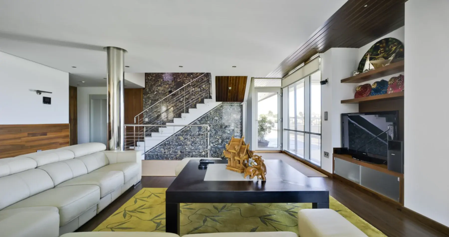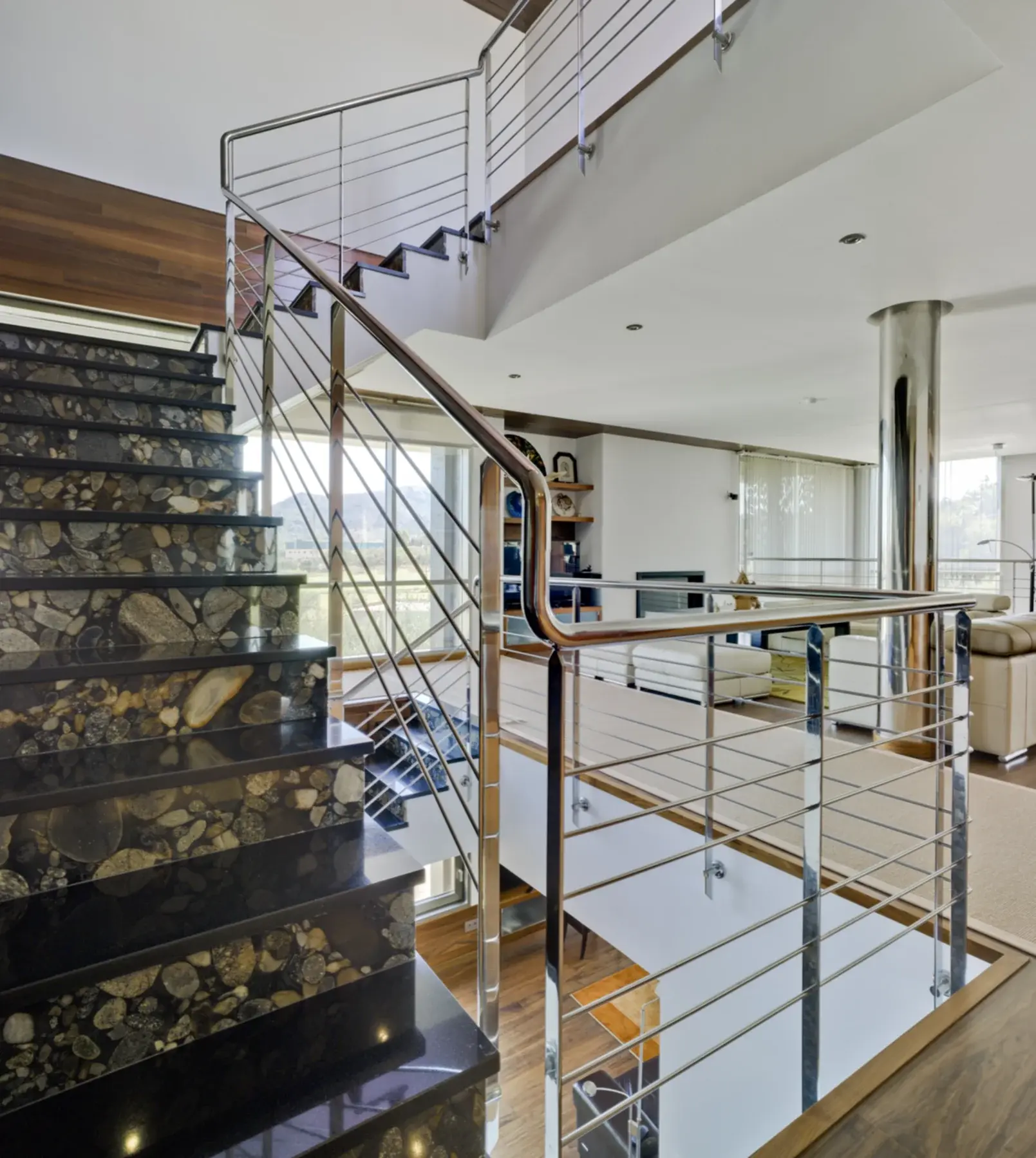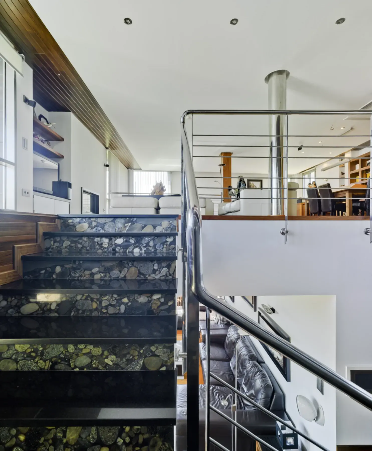 La escalera, custodiada por una pared de piedra natural, introduce una textura sobria y cálida que acompaña el ascenso a la planta superior, donde se ubican las estancias privadas, elevadas sobre el terreno para disfrutar de la luz y las vistas.